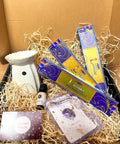 This soothing set includes three Natural Lavender Satya incense packs, lavender essential oil, an amethyst stone with a meaning card, and a pocelain oil burner.